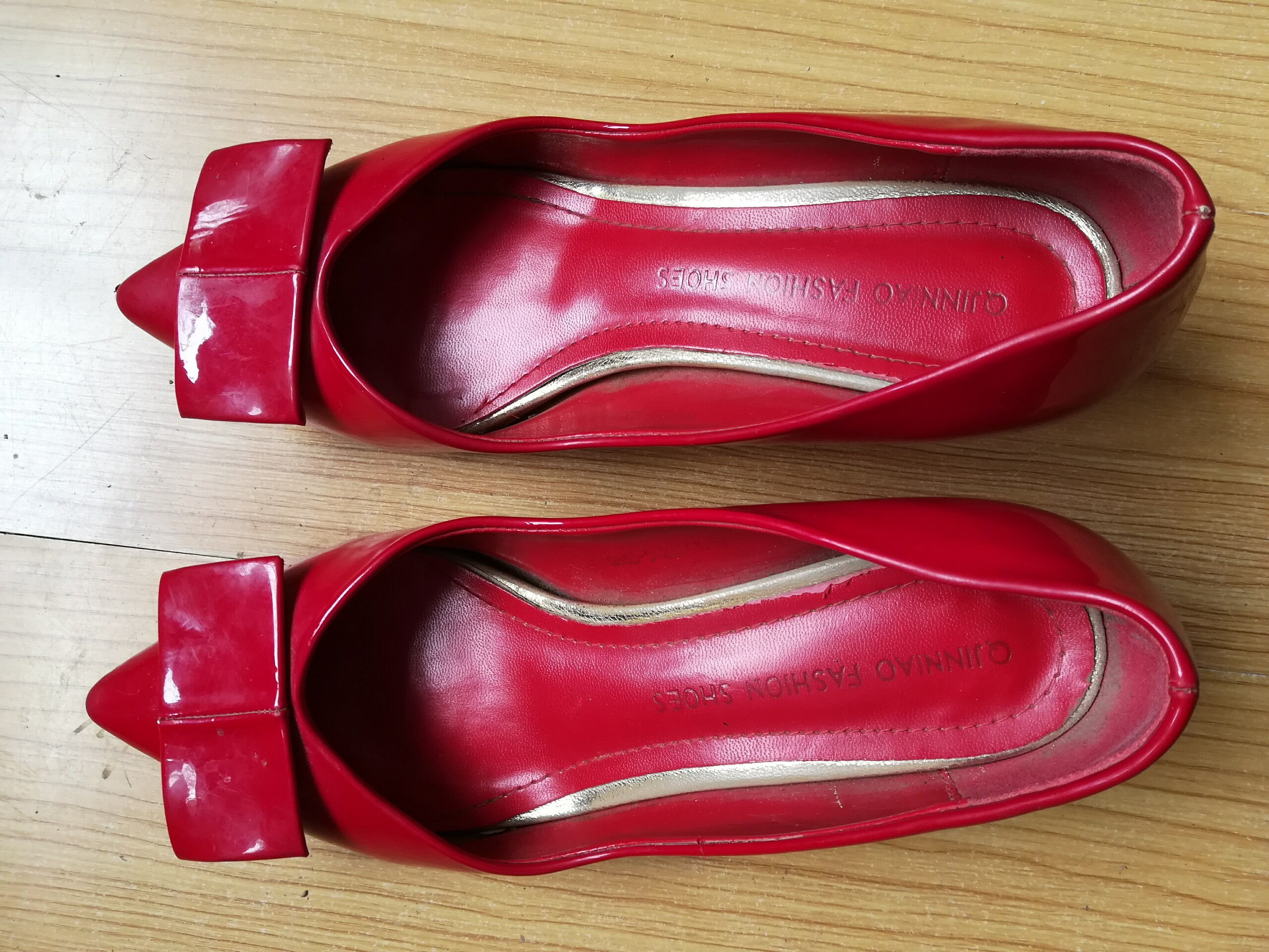 一双红色235码的高跟鞋,应该不是新娘穿的鞋,鞋底已经很旧了。