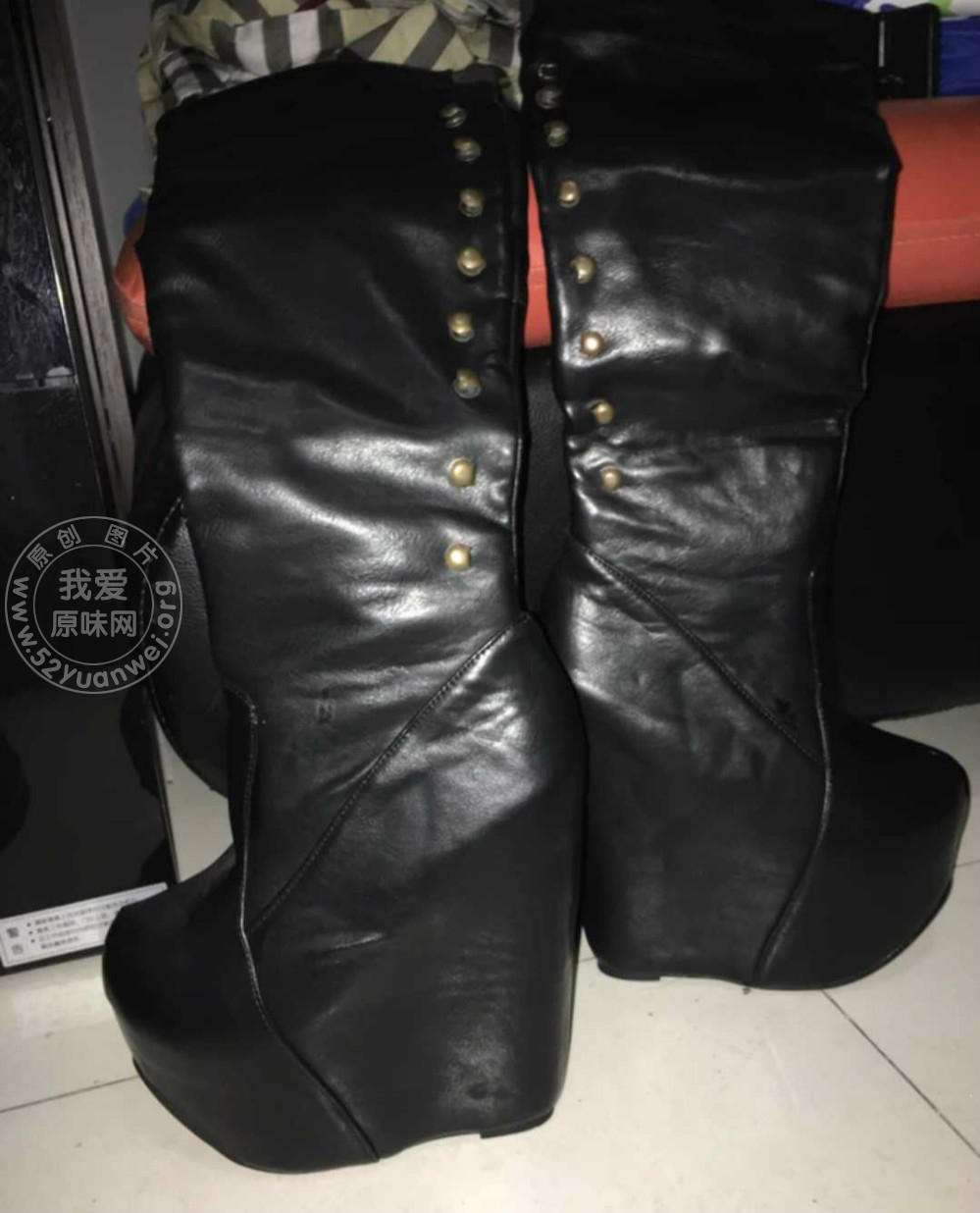 一双黑色的超高坡跟长筒皮靴