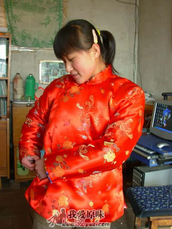 穿红缎袄的少妇与缎被