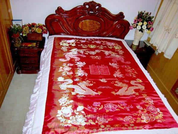 漂亮的丝绸缎被,上面承载了美丽的幸福一生,新娘将自己的一切都托付于其上,甜美的笑容展示了坐在温馨柔汝缎被上的高兴情怀,赋予的是对新生活的渴望。