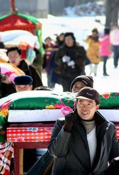 看看东北结婚新娘、新郎跪在缎被上拜天地