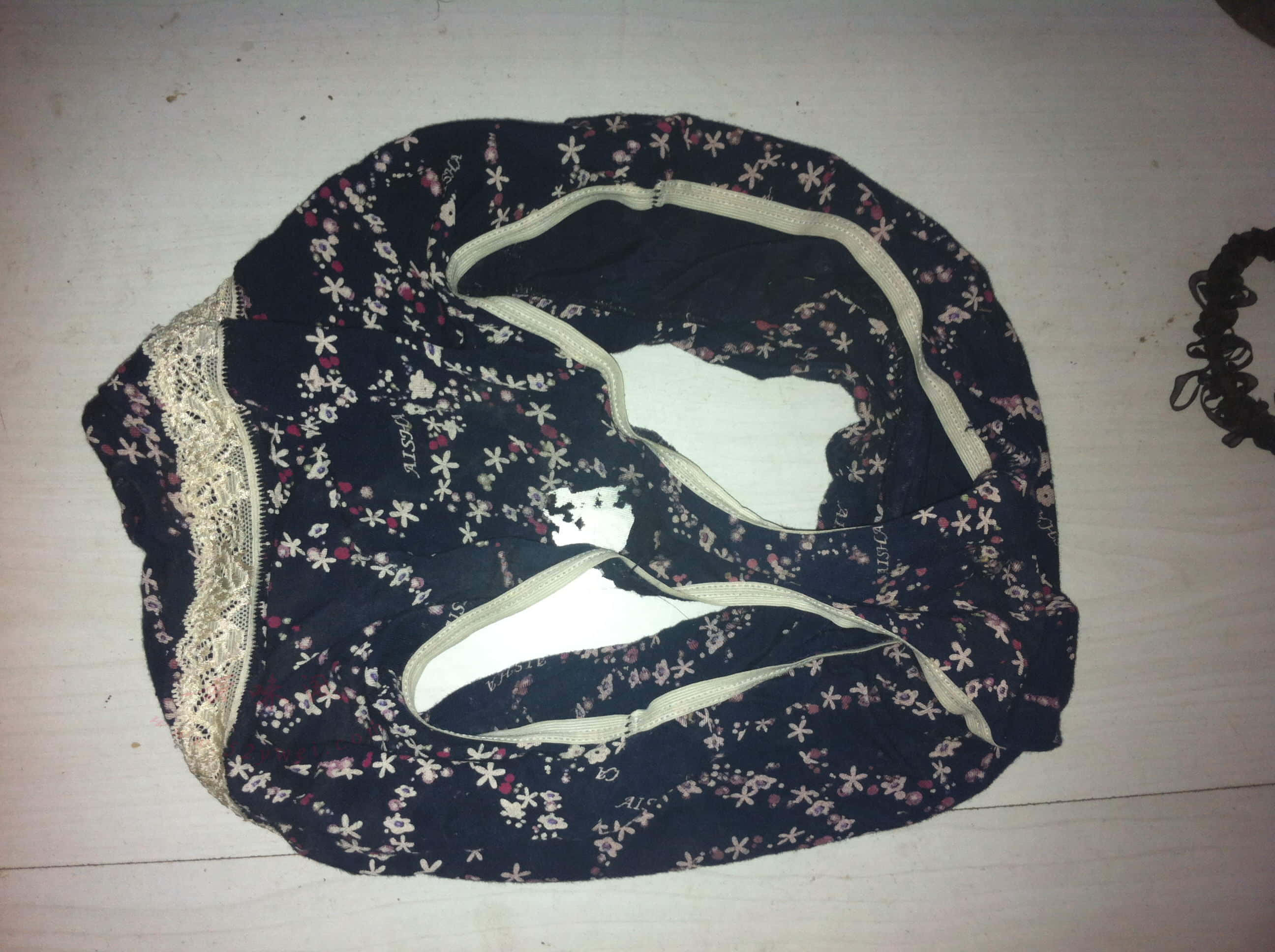 澡堂包间发现的,花色有卡通,看样子30岁左右的内裤。底部有洞,夹的时间很长了,还有毛毛。