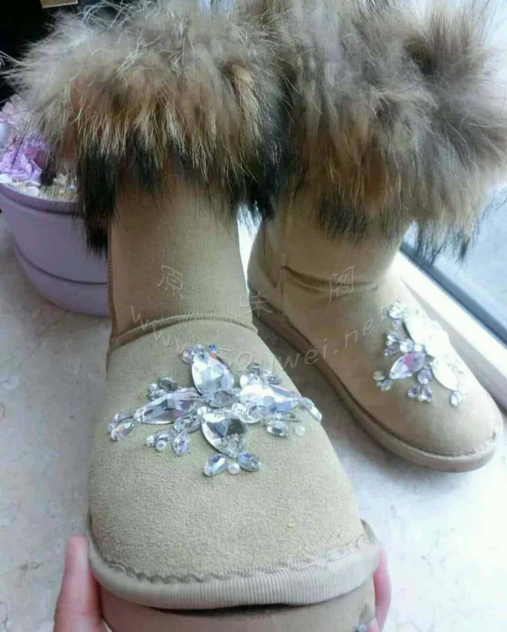 被妹子穿得鞋头开了口的一双很多水钻装饰的毛绒绒雪地靴 ...