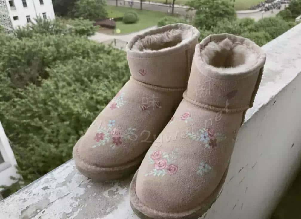 一双晾在阳台上的花图案雪地靴【8p】