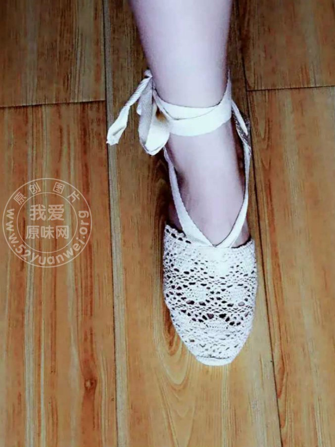 妹子脚上的一双白色网纱坡跟凉鞋