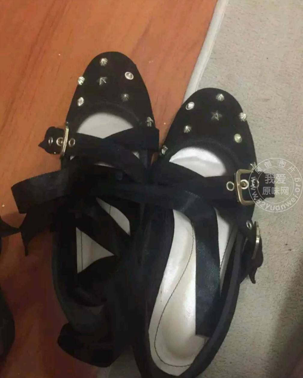 一双带绑带的黑色平底鞋