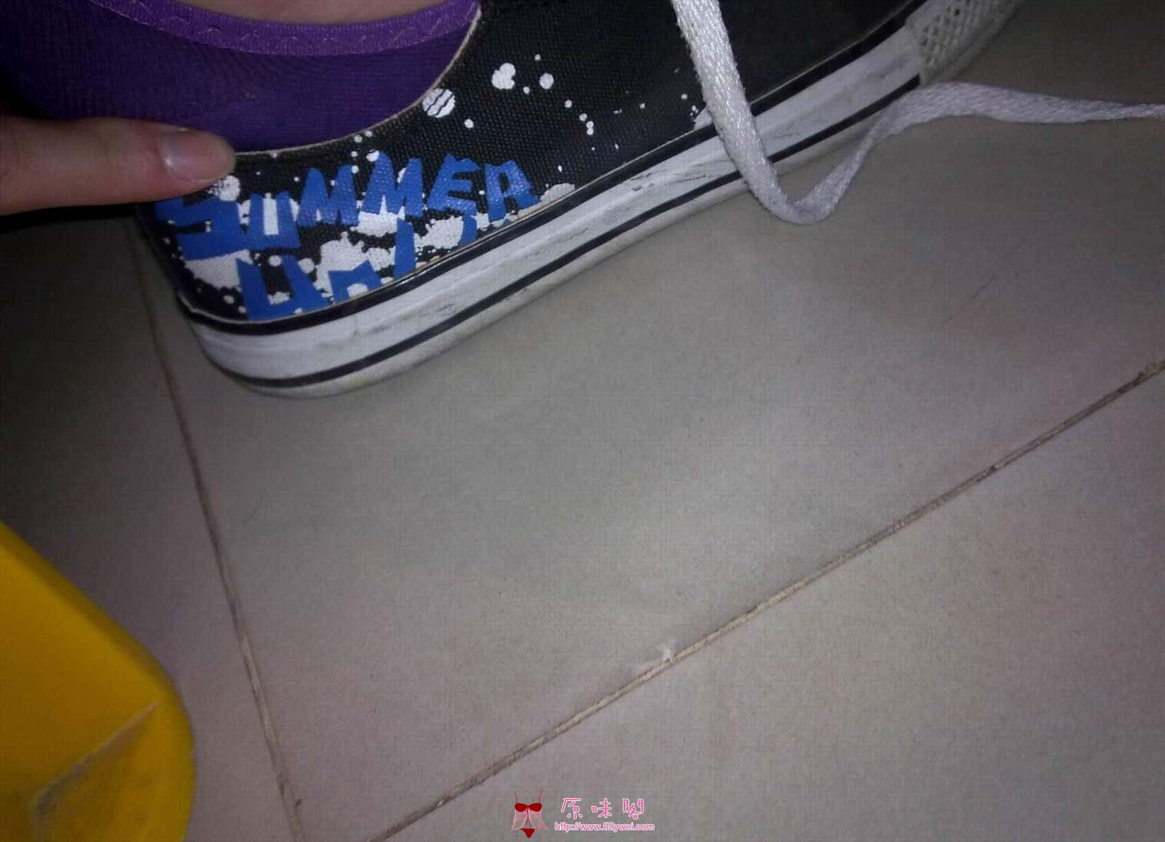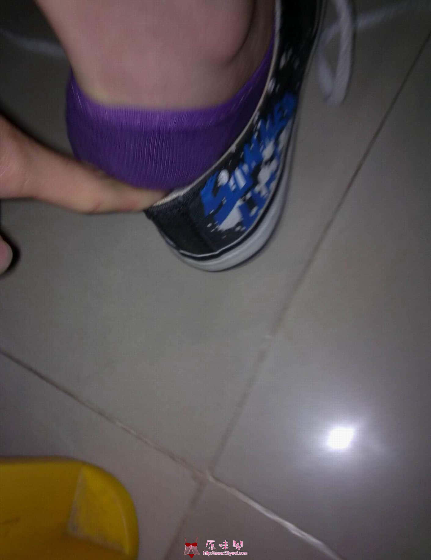 时间:2011年6月29日夜晚19点到20点。由于接近月尾,工作比较多,要加班,那天下着很大雨的,临走的时候,看到一个同事她把帆布鞋脱了换上洞洞鞋,船袜是紫色的,她居然没有脱掉袜子,很少见mm穿洞洞鞋还穿袜子的,尤其是在夏天。我当时偷偷地用手机拍了她换鞋的图片,由于手机快门音关闭不了,所以特别紧张。仅有5张图片,还算清晰,与喜欢船袜帆布鞋mm的同好们分享一下