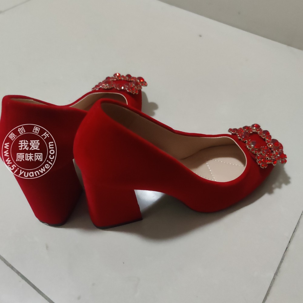 红色厚跟水钻婚鞋
