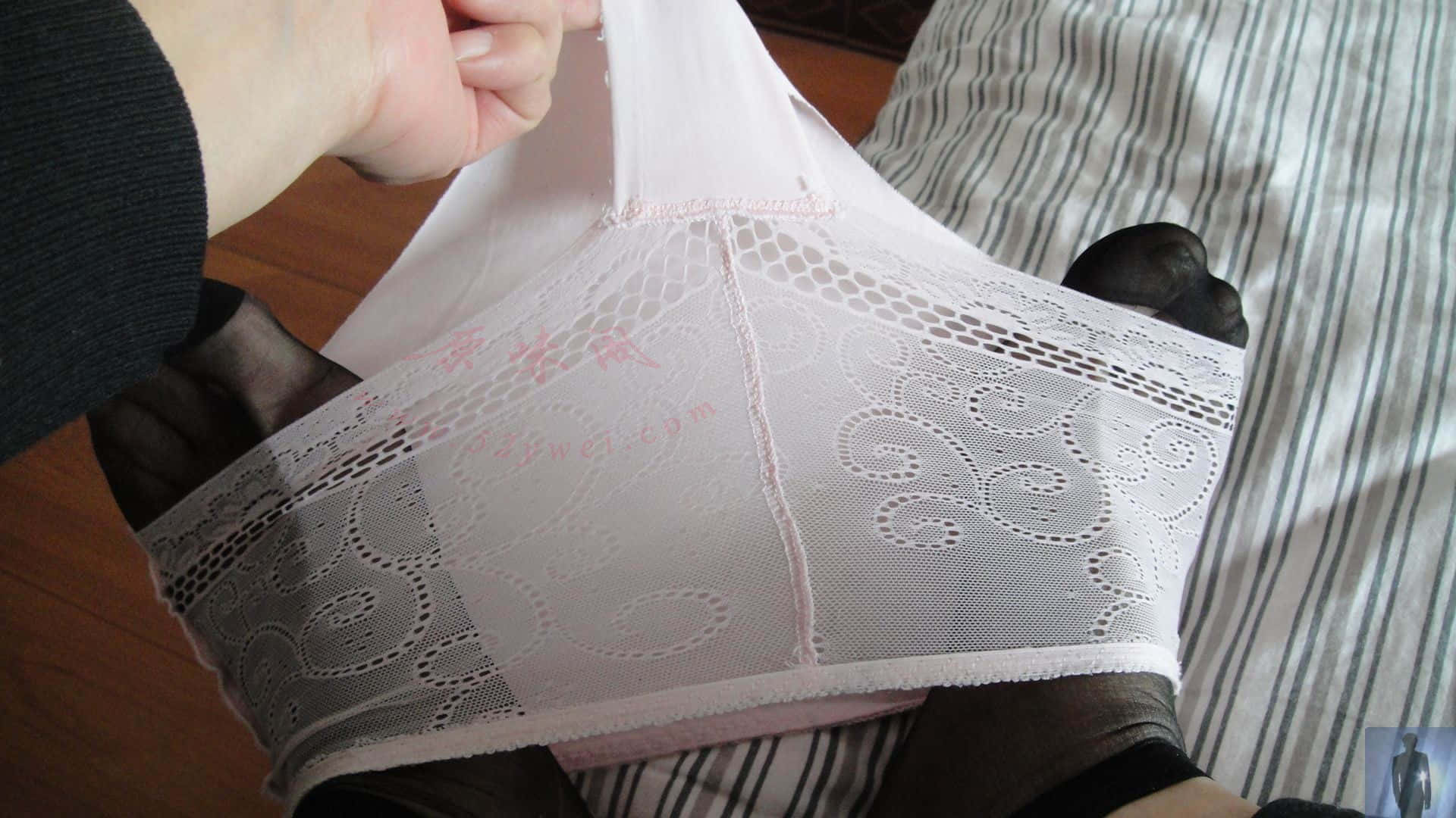 正常的光线下,内内是粉色的。黑丝是那样的薄。